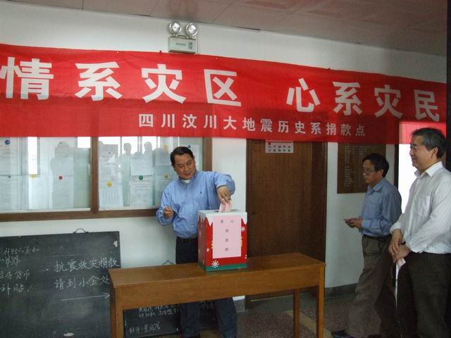 四川省汶川市特大地震引起全国人民的关切,也牵动了南大人的心。5月13日,历史系党政和工会在第一时间召开会议并转发公司党委委托工会关于抗震救灾的紧急通知,动员全系师生为四川灾区人民踊跃捐款。系党政领导班子带头为灾区捐款,广大师生积极投入为抗震救灾进行的捐款活动。世界史和国际关系等专业的研究生还自发地投入捐款的组织活动。截至昨天中午,历史系师生已经捐款28765元人民币。