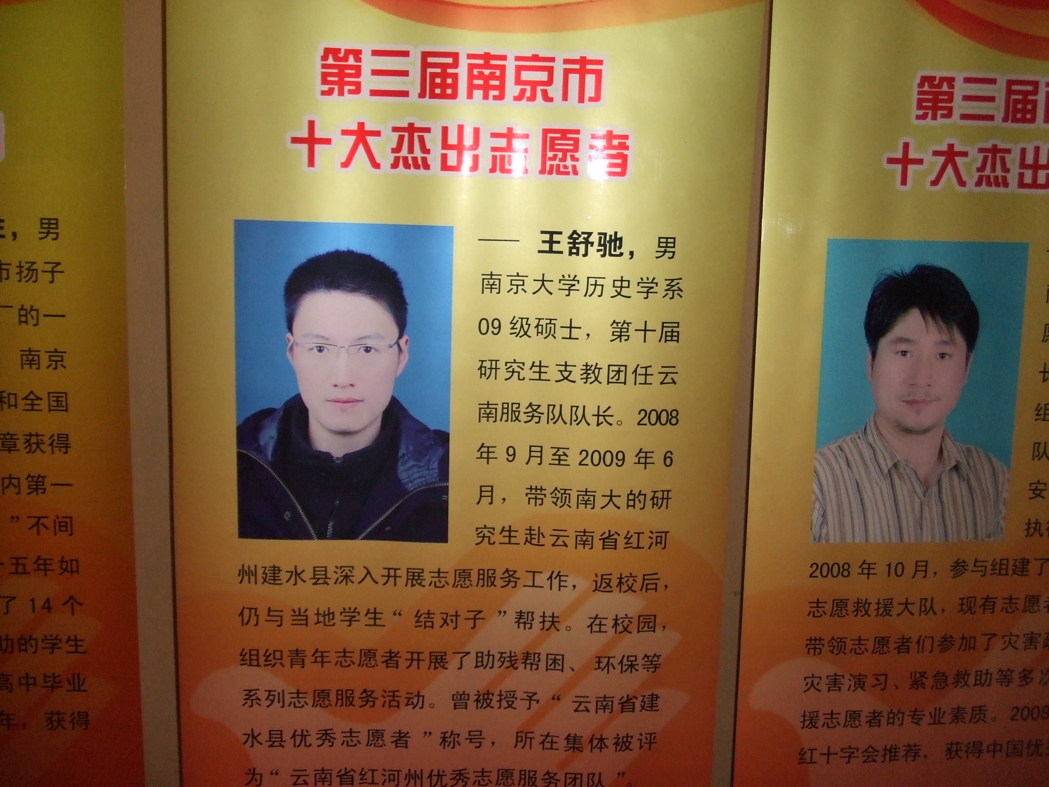 3月5日是“学雷锋纪念日”,也是“南京市志愿者日”。共青团南京市委联合多家单位和媒体在山西路青春剧场举办了“志愿服务青奥行动”启动暨第三届“南京市十大杰出志愿(志愿服务集体)”颁奖仪式。会上,市委常委许慧玲、团省委副书记张国梁等领导出席会议并为获奖者颁奖。我系王舒驰同学获“南京市十大杰出志愿者”称号,并在颁奖仪式后进行了个人事迹宣讲。 王舒驰同学系我系中国近现代史09级硕士,太阳成tyc122cc第十届研究生支教团云南服务队队长,于2008年9月至2009年7月赴云南省红河州建水县开展志愿服务工作。他的获奖,是我系长期重视员工思想道德工作的成果,也是我系广大同学心怀爱心、乐于助人,积极服务于社会主义和谐社会的重要体现。