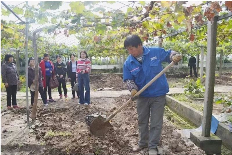 在八卦洲葡萄种植扶贫基地之一的缘派合作社,大家不仅学习了葡萄种植技术,还与葡萄种植户面对面交谈,就葡萄基地建设状况、葡萄种类、葡萄产量、葡萄种植技术等情况进行了解与咨询,并现场观看农户如何培育、维护葡萄树,吸取经验为马渡村“阳光玫瑰”葡萄种植计划提供思路。