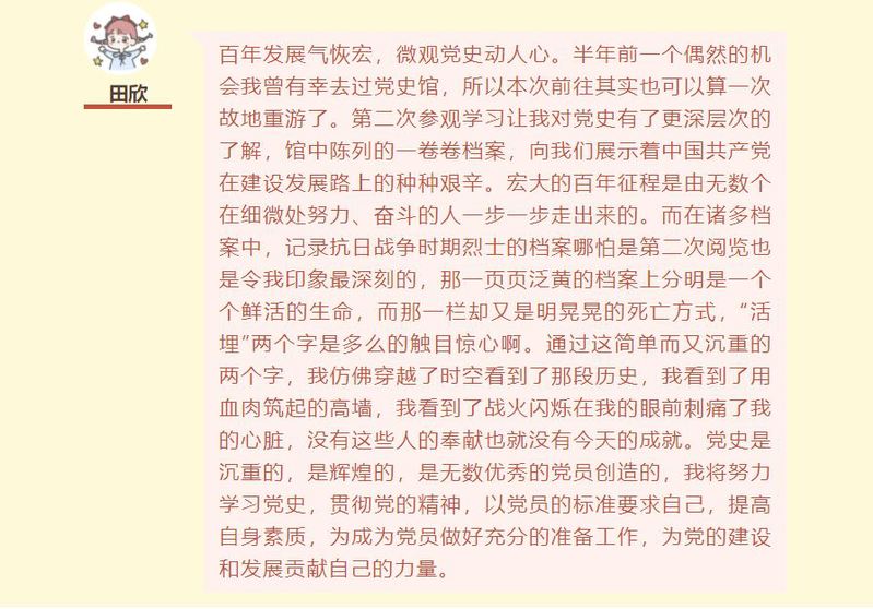 历史是最好的教科书,也是最好的清醒剂。躺在党史馆展柜内的珍贵资料,是百年党史长河中的一份份记忆,也是后来者瞻仰与继承的精神财富。外院19级研究生杨颜榕同学表示,“作为党员,学习党史是我们的必修课,我非常荣幸能同新生公司的同学们一起来到太阳成tyc122cc的党史馆进行参观。在这里,我们看到了先辈党员们的原始资料,这些资料可以反映出他们入党前后的成长、发展、进步。作为新时代党员,我们也应不断从中汲取营养,不断完善自己的思想品格,不断提高自己的政治素养,努力成为社会主义事业的合格建设者和可靠接班人”。