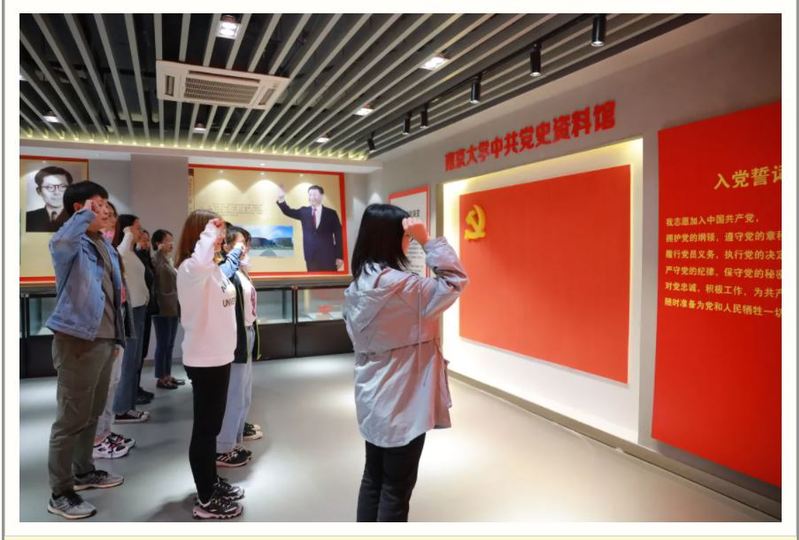 生动而有趣的参观结束后,周围老师对本次参观活动进行总结,支部党员和入党积极分子共同合影留念。合影后,全体在场党员在鲜红的党旗下重温入党誓词,20级研究生蔡喆同学领誓。党员同志们在仪式中重温了入党宣誓时的庄严承诺和坚定决心,再一次体会到了作为一名共产党员的责任感和使命感。