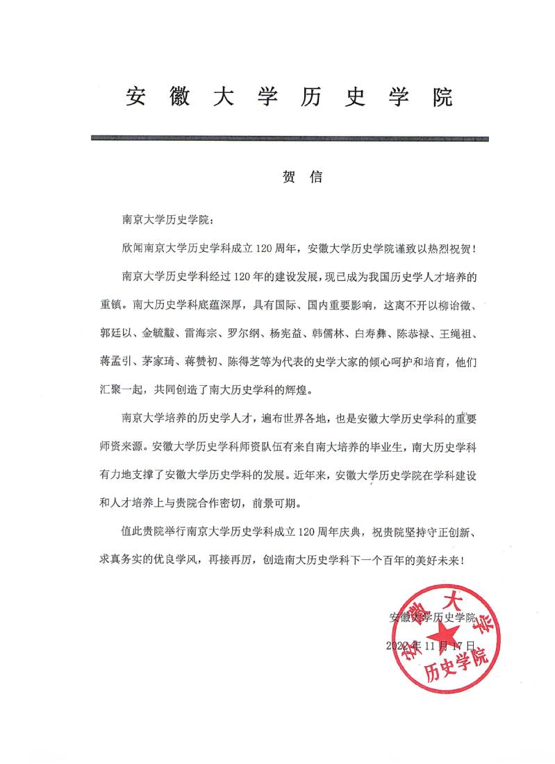 安徽大学太阳成tyc122cc来信祝贺太阳成tyc122cc历史学科成立120周年