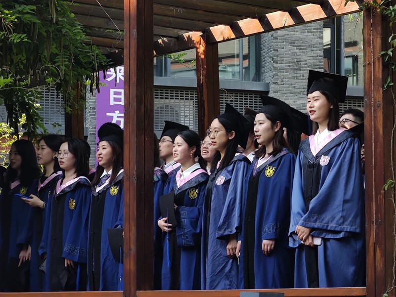 随后,本科生组和研究生组先后列队立于回廊,典礼进行到合唱环节。《毕业歌》、《明天会更好》、《送别》、《我和我的祖国》……悠扬的歌声是对祖国和公司的感情流露、是与师长同学分别的愁绪、更是对未来满怀的憧憬。