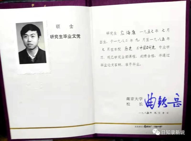 应海康1985年获得的硕士毕业证