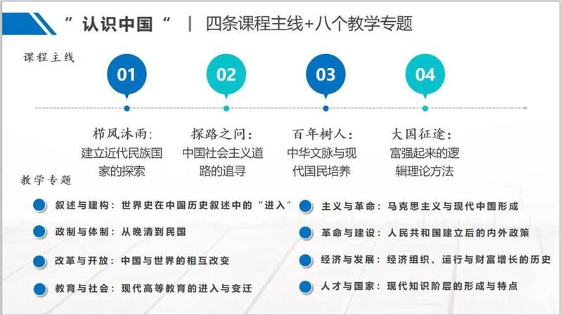 课程主线主要由四个方面构成:一、栉风沐雨:建立近代民族国家的探索;二、探路之问:中国社会主义道路的追寻;三、百年树人:中华文脉与现代国民培养;四、大国征途:富强起来的逻辑理论方法。按照课程主线,教学团队以专题为教学单元模式,共安排八个教学专题,分别是:1、叙述与建构:世界史在中国历史叙述中的“进入”;2、主义与革命:马克思主义与现代中国形成;3、政制与体制:从晚清到民国;4、革命与建设:人民共和国建立后的内外政策;5、改革与开放:中国与世界的相互改变;6、经济与发展:经济组织、运行与财富增长的历史;7、教育与社会:现代高等教育的进入与变迁;8、人才与国家:现代知识阶层的形成与特点。