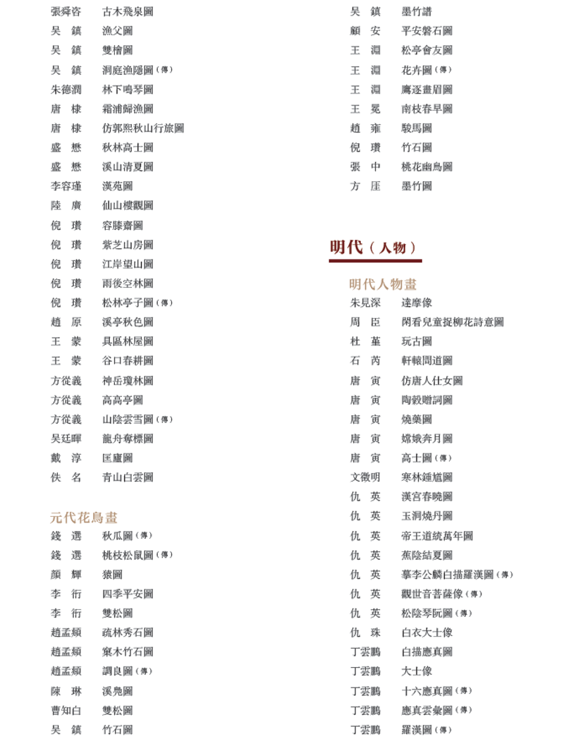 本书保留了藏品的原初定名,并吸纳了多年来的鉴定成果。一些作品经学术研究可能为后世摹本或画家存疑,其作品名后加(传)。作品说明中对鉴定意见也多做扼要介绍。