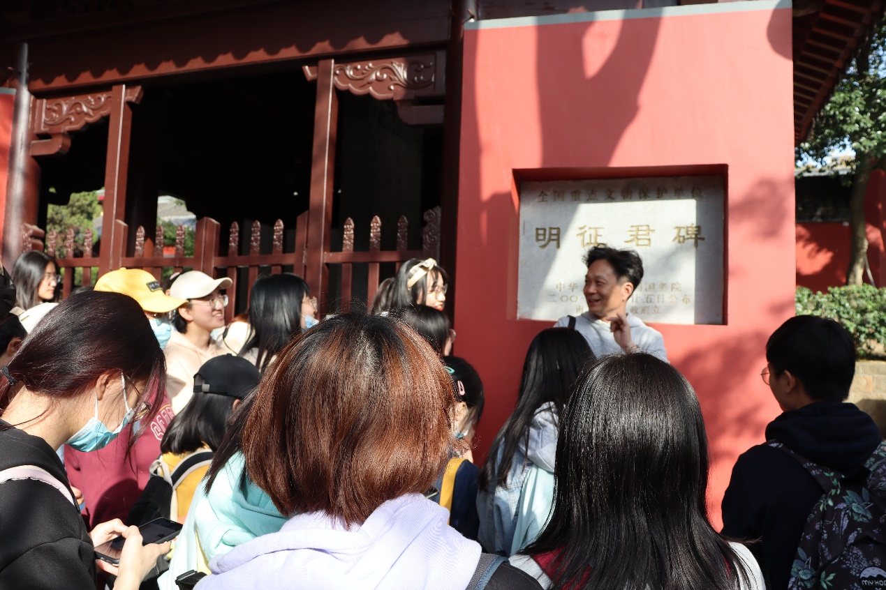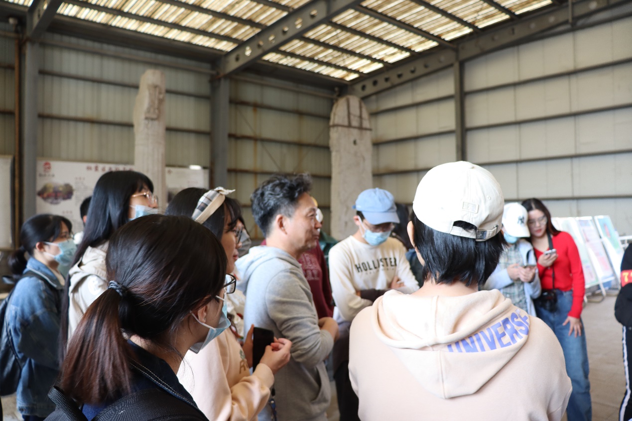 随后的第二站是栖霞十月村梁萧景墓,张学锋老师提及十月村的名称由来,将萧景墓的石刻与萧统墓的石刻相对比,为同学们区分了两个时代石刻的不同特色,譬如兽须和兽翼的不同。同时,还为同学们介绍了具有中西文化相交融特色的萧景墓神道柱。不仅同学们倍感兴趣,还吸引了一些行人驻足倾听学习。