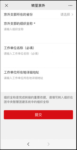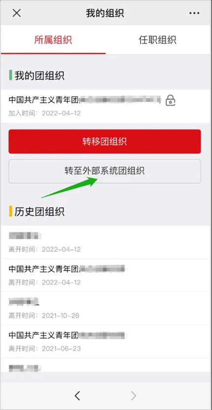 转出组织使用北京、广东、福建系统的2025级研究生新生团员,登录线上系统手机端,在“我的”菜单栏中,点击“我的组织”“转至外部系统团组织”,“转出原因”选择“升学”,根据研究生录取专业,进行组织名称搜索和选择。