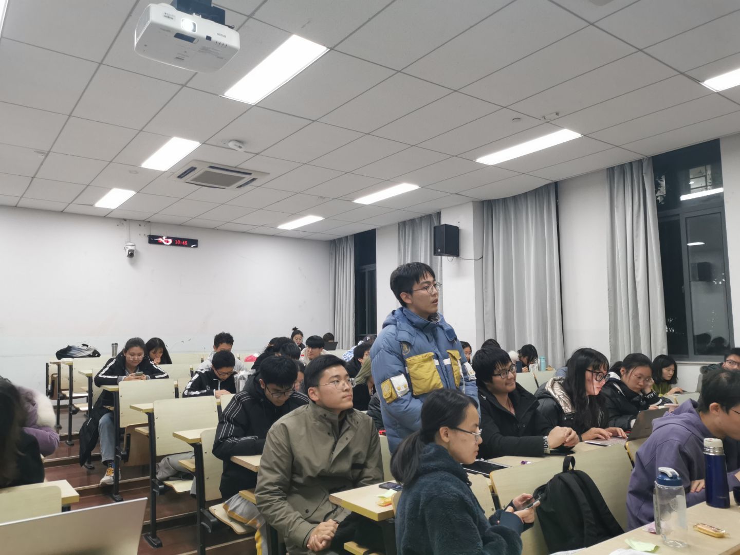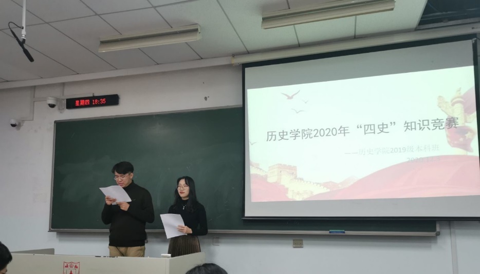 12月4日晚,竞赛开始,主持人介绍比赛流程以及比赛规则,本次知识竞赛以“新四史”知识普及为核心。比赛分为个人必答题、抢答题,为提高现场同学参与度,竞赛还设置了现场互动题。