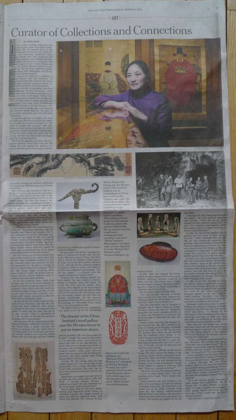 “楚王梦”当时是海馆长原创系列“中国展”中的最后一个,自2003年起14年间宏观上运筹帷幄,微观上具体而微,她共举办15个独特的专题性、学术性展览,多数展览还出版了精美的中英文图录,《纽约时报》曾辟整版对她作介绍。因为“楚王梦”展览的成功,华美协进社和董事会继续要求海馆长策划原创中国展,目前日程上已确定了两个,她谦称得继续努力呢。