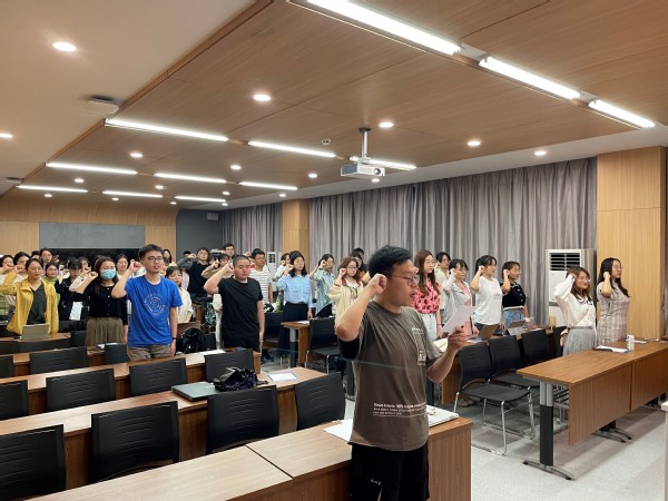 会议开始由团支部书记谈薇主持新团员入团仪式、老团员重温入团誓词。在团支部副书记常远的带领下,全体团员将右拳高举过肩,齐声宣誓,在神圣庄严的仪式感中凝聚共识,增强共青团员意识。