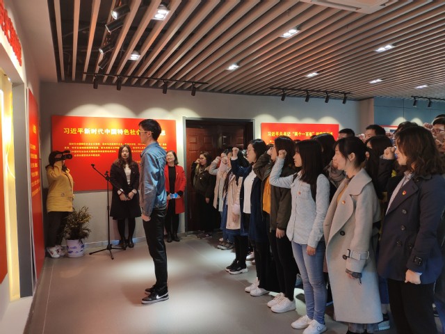 参观学习完中共党史资料馆,全体预备党员同志进行了庄严的宣誓仪式。国际歌奏响过后,在本科生党员代表江锐捷同志的领誓下,56名预备党员郑重宣誓。短短一百多字的誓词,宣告了党员同学们对党的坚定承诺。不忘初心,牢记使命!