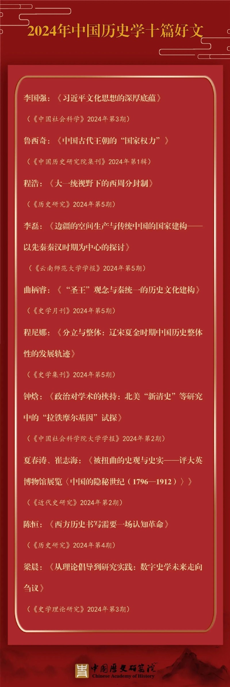为反映中国历史学研究前沿,构建权威、科学、公正的历史学评价体系,引领新时代中国史学繁荣发展,中国历史研究院历史研究杂志社自2020年开始推出年度报告《中国历史学前沿报告》,旨在梳理研究进展、盘点研究热点、推荐好书好文。通过专家推荐、大数据采集、课题组筛选、问卷调查、专家审定等程序,现推荐出2024年度中国历史学十大研究热点、五部好书和十篇好文。近日,中国历史研究院正式公布“2024年中国历史学十篇好文”入选名单,公司梁晨教授论文《从理论倡导到研究实践:数字史学未来走向刍议》成功入选。